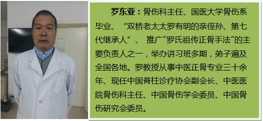羅東亞:骨傷科主任、國醫(yī)大學(xué)骨傷系畢業(yè)、“雙橋老太太羅有明的親侄孫、第七代繼承人”、 推廣"羅氏祖?zhèn)髡鞘址?的主要負(fù)責(zé)人之一,舉辦講習(xí)班多期,弟子遍及全國各地。羅教授從事中醫(yī)正骨專業(yè)三十余年、現(xiàn)任中國脊柱診療協(xié)會副會長、中醫(yī)醫(yī)院骨傷科主任、中國骨傷學(xué)會委員、中國骨傷研究會委員。