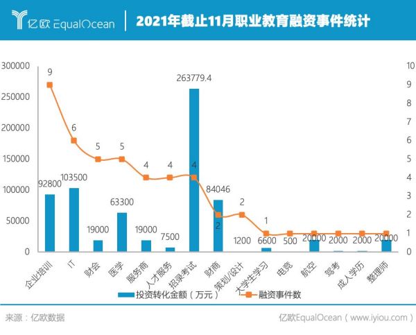 除了政策利好,職業(yè)教育亦受到資本青睞。截止11月,2021年已有云學(xué)堂、UMU互動(dòng)學(xué)習(xí)平臺(tái)、課觀教育、三節(jié)課等多家職業(yè)教育相關(guān)企業(yè)獲得多輪融資,融資事件累計(jì)達(dá)56次,并迎來(lái)了傳智教育、職業(yè)教育兩家職業(yè)教育企業(yè)的上市,覆蓋職業(yè)教育中服務(wù)提供商和學(xué)習(xí)咨詢平臺(tái)。 根據(jù)億歐智庫(kù)數(shù)據(jù)顯示,2021年截止11月,職業(yè)教育融資事件中,A輪融資和并購(gòu)項(xiàng)目數(shù)量最多超過(guò)行業(yè)整體的三分之一,而從細(xì)分的投資方向來(lái)看,企業(yè)培訓(xùn)類企業(yè)在今年的融資較多,IT、招錄考試、財(cái)商和醫(yī)學(xué)類賽道也是資本市場(chǎng)較為活躍和關(guān)注的領(lǐng)域。