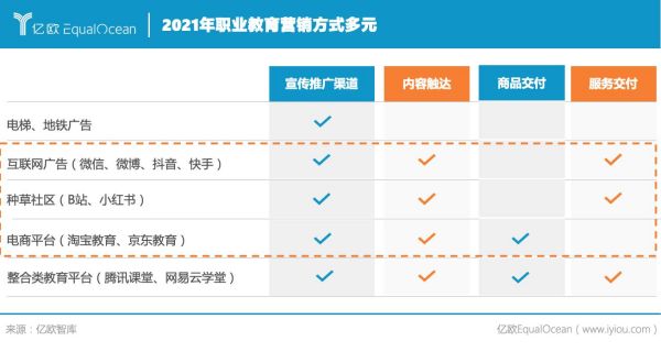以就業(yè)為導(dǎo)向的人才適應(yīng)性提升 職業(yè)教育作為以就業(yè)為導(dǎo)向的教育方式,其適應(yīng)性不僅只體現(xiàn)在人才培養(yǎng)上,還在于人才的管理和服務(wù)。 在人才培養(yǎng)的學(xué)歷階段,職業(yè)院校是主要的培養(yǎng)方,2021年10月中共中央辦公廳、國(guó)務(wù)院辦公廳印發(fā)《關(guān)于推動(dòng)現(xiàn)代職業(yè)教育高質(zhì)量發(fā)展的意見》就加快構(gòu)建現(xiàn)代職業(yè)教育體系做出進(jìn)一步的部署。人才適應(yīng)能力的提升一方面來(lái)自于職業(yè)教育體系和普通教育體系的橫向融通和縱向貫通,打通升學(xué)渠道,另一方面則是面向市場(chǎng),以企業(yè)崗位需求為目標(biāo),通過(guò)綜合的育人機(jī)制,改善職業(yè)教育學(xué)歷階段的人才供給結(jié)構(gòu)。 企業(yè)則是通過(guò)校企合作和自主培養(yǎng),輸出資金、技術(shù)、實(shí)踐案例,吸納專業(yè)人才,強(qiáng)化品牌認(rèn)知。 隨著靈活用工方式的出現(xiàn)從人員招聘、用工管理到員工技能培訓(xùn)、權(quán)益保障都有對(duì)應(yīng)的服務(wù)提供,人與崗位,人才與企業(yè)之間匹配的靈活性增加、時(shí)效性增強(qiáng),帶來(lái)了人才服務(wù)效率的整體提升。 在線化職業(yè)教育服務(wù)交付 在線化服務(wù)交付,顧名思義,教育的在線化是社會(huì)經(jīng)濟(jì)高質(zhì)量飛躍、互聯(lián)網(wǎng)等技術(shù)成熟發(fā)展的必然結(jié)果,在不斷提高的互聯(lián)網(wǎng)普及率和新冠疫情的沖擊下,職業(yè)教育的全面在線化為行業(yè)升級(jí)的新成果。而招生營(yíng)銷和教學(xué)形式的全面升級(jí)是職業(yè)教育在線化后表現(xiàn)最為突出的兩方面。
