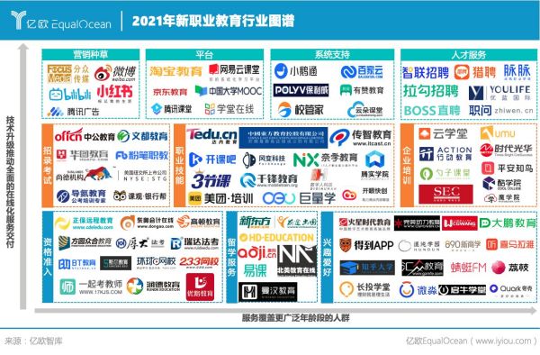 02圍繞適應(yīng)性、在線化、終身化的新職業(yè)教育發(fā)展新形態(tài) 在傳統(tǒng)職業(yè)技能培養(yǎng)的需求仍舊旺盛的情況下,新興的行業(yè)所孕育的新的職業(yè)技能培訓(xùn)相繼入局。部分K12教育企業(yè)嘗試布局;淘寶教育、京東教育等則是為職業(yè)教育企業(yè)的電商運(yùn)營(yíng)提供了新的場(chǎng)景。 一方面,技術(shù)的升級(jí)推動(dòng)了新職業(yè)教育在營(yíng)銷種草,在線學(xué)習(xí),系統(tǒng)支持,人才服務(wù)等環(huán)節(jié)上的全面在線化升級(jí),另一方面,隨著退休年齡的延長(zhǎng),職業(yè)教育的潛在人群規(guī)模不斷擴(kuò)大,職業(yè)群體對(duì)于學(xué)習(xí)課程內(nèi)容也逐漸多樣化,隨之而來(lái)產(chǎn)生了大量的企業(yè)提供對(duì)應(yīng)的學(xué)習(xí)服務(wù)。頭部互聯(lián)網(wǎng)公司也開始發(fā)揮自身在新興產(chǎn)業(yè)人才培養(yǎng)上的優(yōu)勢(shì),提供相應(yīng)的職業(yè)教育服務(wù),受到尋求新興職業(yè)發(fā)展的人群青睞。 億歐智庫(kù)認(rèn)為,圍繞適應(yīng)性、在線化、終身化三大發(fā)展方向,職業(yè)教發(fā)展趨于繁榮的同時(shí)逐漸延伸出三類發(fā)展新形態(tài)。
