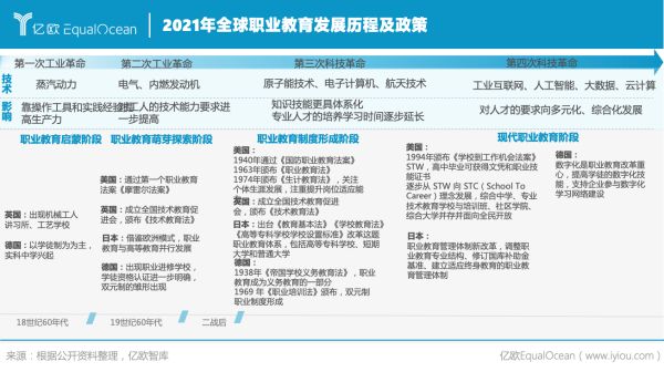 第一次工業(yè)革命后,以學(xué)徒制為主的職業(yè)教育萌芽出現(xiàn),主要以英國(guó)、德國(guó)職業(yè)教育體系為代表;二戰(zhàn)后,各國(guó)產(chǎn)業(yè)結(jié)構(gòu)呈現(xiàn)多元豐富的發(fā)展趨勢(shì),職業(yè)教育逐步實(shí)現(xiàn)制度化、體系化發(fā)展,英美日德各自頒布職業(yè)教育相關(guān)法律促進(jìn)職業(yè)教育規(guī)范化發(fā)展;信息化時(shí)代來(lái)臨,信息網(wǎng)絡(luò)數(shù)字化為主的職業(yè)教育培訓(xùn)迎來(lái)新的發(fā)展期。