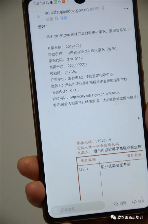 在12月6日,煙臺市波絲蒂中西糕點職業(yè)技能培訓學校成功開出煙臺市的首張財政電子票據(0600000001號),學校繳納的“職業(yè)技能鑒定考試費”直接繳入國庫,同時標志著煙臺市財政電子票據管理改革正式實施,煙臺正式邁入財政電子票據時代,這也讓煙臺波絲蒂的職業(yè)技能鑒定工作更加便捷高效。