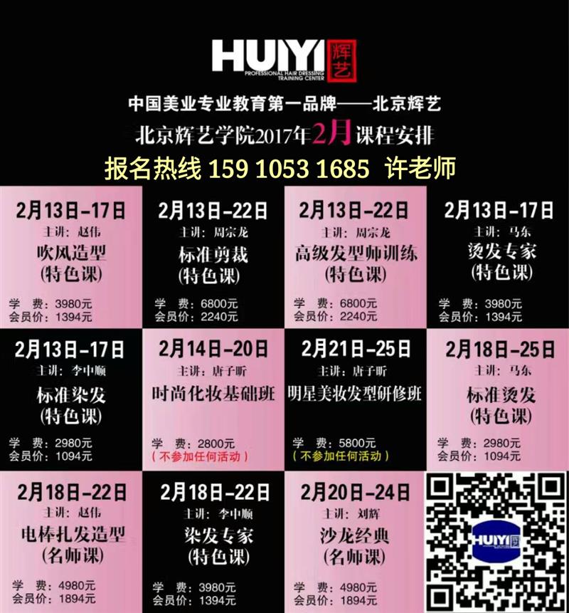 2017年北京輝藝美發(fā)化妝學(xué)院2月13日開課,5科課程接受報(bào)名【吹風(fēng)造型】【標(biāo)準(zhǔn)剪裁】【高級(jí)發(fā)型師訓(xùn)練】【燙發(fā)專家】【標(biāo)準(zhǔn)染發(fā)】每月循環(huán)開課10門以上,更多資訊請(qǐng)?zhí)砑游?.