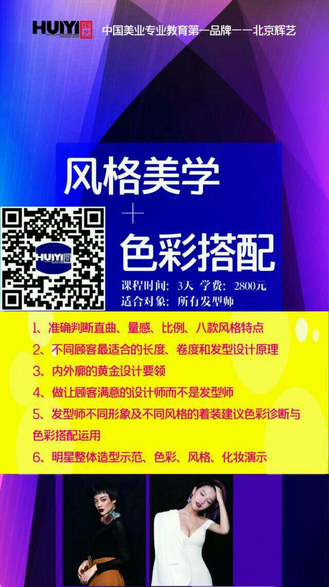 北京輝藝學(xué)院 4月11-13號(hào)《風(fēng)格美學(xué)與色彩搭配》開課 學(xué)費(fèi)2800元/人 風(fēng)格美學(xué)課程內(nèi)容: 1、準(zhǔn)確判斷直曲、量感、比例、八大風(fēng)格特點(diǎn) 2、不同顧客最適合的長(zhǎng)度、卷度和發(fā)..