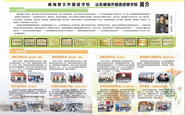 山東威海外國(guó)語(yǔ)進(jìn)修學(xué)院學(xué)校概況 山東威海外國(guó)語(yǔ)進(jìn)修學(xué)院(威海景義外國(guó)語(yǔ)學(xué)校)始建于1988年,學(xué)校始建于1988年,原名文登中日友好日語(yǔ)中等專業(yè)學(xué)校、民辦文登外語(yǔ)學(xué)校,是山東省早創(chuàng)設(shè)的民辦外語(yǔ)院校。學(xué)校具有職業(yè)中專、普通中專、非學(xué)歷高等教育、南開(kāi)大學(xué)現(xiàn)代遠(yuǎn)程教育辦學(xué)資格。 山東威海外國(guó)語(yǔ)進(jìn)修學(xué)院坐落于威海市文登區(qū),占地76畝,建筑面積16000平方米,教學(xué)班30個(gè),在校生1000余名,其中外國(guó)留學(xué)生32人;教職員工61人,其中外教5人。設(shè)商務(wù)英語(yǔ)、商務(wù)日語(yǔ)、商務(wù)韓語(yǔ)、電子商務(wù)、計(jì)算機(jī)平面設(shè)計(jì)、農(nóng)村經(jīng)濟(jì)綜合管理等專業(yè),其中商務(wù)韓語(yǔ)、日語(yǔ)專業(yè)系威海市中等職業(yè)技術(shù)學(xué)校..