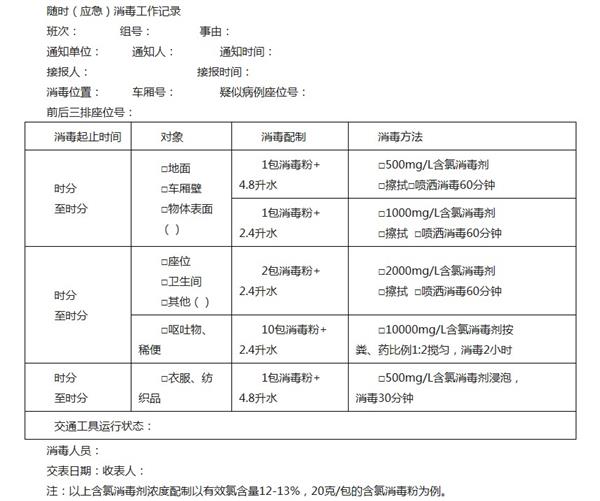2.根據(jù)疾控部門的指導(dǎo)確定消毒范圍,對疑似病例的生活用品(包括餐具、洗漱用品、痰罐等)、排泄物、嘔吐物(含口鼻分泌物、膿液、痂皮等)等,用應(yīng)急嘔吐包覆蓋包裹,或用干毛巾覆蓋后噴灑10000mg/L含氯消毒劑至濕潤;對疑似病例座位及其前后三排座位用有效氯1000mg/L-2000mg/L含氯消毒劑進(jìn)行噴霧處理或2-3遍的擦拭消毒。具體方法由疾控中心對相關(guān)人員進(jìn)行培訓(xùn)。