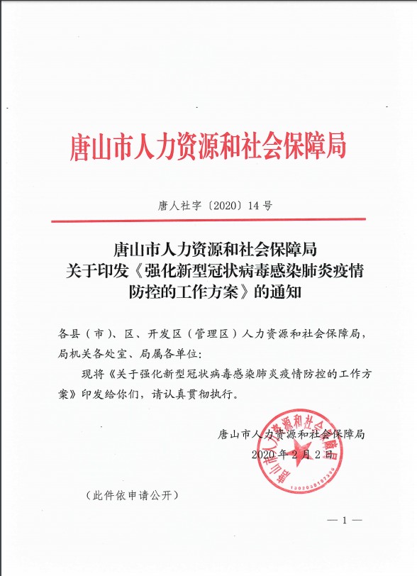 唐山市人社局關于印發(fā)《強化新型冠狀病毒感染的肺炎疫情防控的工作方案》的通知