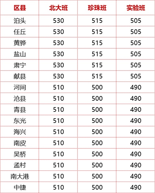 本部各類班級(jí)控制分?jǐn)?shù)為:其中,明珠班505分實(shí)驗(yàn)班470分;奮進(jìn)班440分;普通班430分;文化路校區(qū)全市錄取基準(zhǔn)線為405分。各初中校依據(jù)分配指標(biāo),由黃驊市教育局劃定具體錄取分?jǐn)?shù)線。