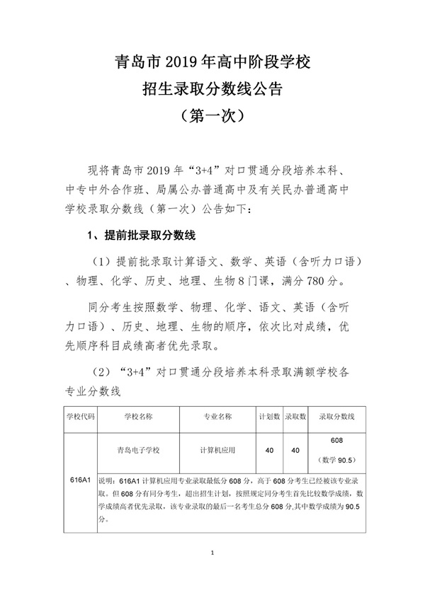 2019年山東青島中考高中學(xué)校錄取分數(shù)線公布了,具體內(nèi)容如下所示: