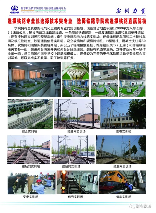 衡水職業(yè)技術(shù)學院電氣化鐵道運輸類專業(yè)是學院與中國中鐵深入校企合作、產(chǎn)教融合共建特色專業(yè),打造鐵路和軌道交通行業(yè)“文化素質(zhì)+職業(yè)技能”的新型大學生人才培養(yǎng)模式,是全國鐵路企業(yè)舉辦的電氣化鐵道運輸類專業(yè)的國家級重點職業(yè)院校,是國家電氣化鐵道運輸類和地鐵行業(yè)后備力量的主要來源,是中國電氣化鐵道運輸類高技能人才培養(yǎng)基地。學院下設(shè)"鐵道供電技術(shù)”、“鐵道信號自動控制"、城市軌道交通運營管理"、“鐵道機車運用與維護”專業(yè),具備了全日制大專學生的培養(yǎng)資格,打造鐵路及軌道交通行業(yè)"文化素質(zhì)+職業(yè)技能"的新型大學生人才培養(yǎng)模式,突出   "應(yīng)用"  與  "技能"兩個特點,在提高大學生文化素質(zhì)的基礎(chǔ)上,運用學校雄厚師資和全真鐵路"四電"及運輸專業(yè)綜合實訓基地開展“真刀真槍"的實訓課程.使培養(yǎng)出來的大學生不是只懂理論知識的花瓶,而是成為I正掌握實際操作技能的優(yōu)秀者。