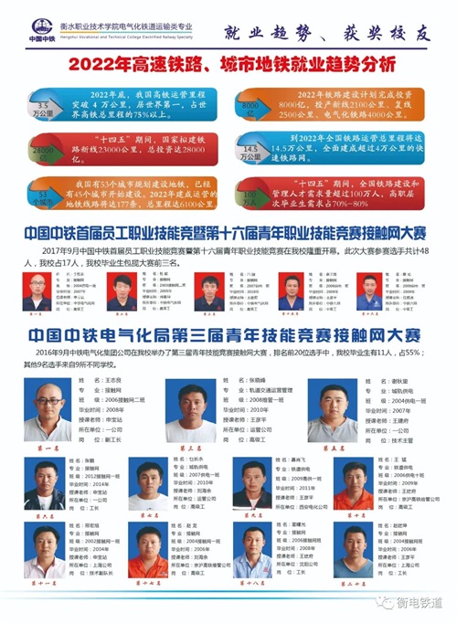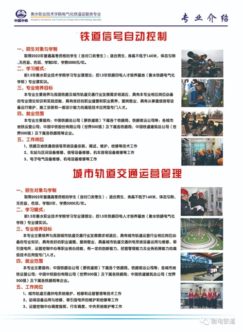 1、 中鐵直屬:衡水職業(yè)技術(shù)學院電氣化鐵道運輸類專業(yè)是與中國中鐵總公司深入校企合作,產(chǎn)教融合,以培養(yǎng)高技能電氣化鐵路及軌道交通人才為主的公辦職業(yè)院校。辦學綜合能力強,信譽可靠,認可度高。